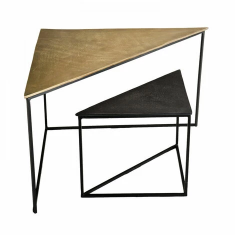 Set de 2 tables gigognes triangles aluminium doré et noir – pieds métal noirs. Dimensions : 71,5 x 66 x 48 cm. Article en Aluminium et Métal. Collection indéfinissable tellement elle resplendit par la noblesse de sa matière. En un clin d’œil, cette gamme aux allures orientales illuminera votre intérieur avec sa couleur dorée et argentée. Ces tables gigognes rectangulaires sont très originales. Leurs formes atypiques garantissent un rendu élégant. Leurs plateaux noirs et dorés ainsi que le piétement en métal artisanal feront toute la différence. Meuble monté