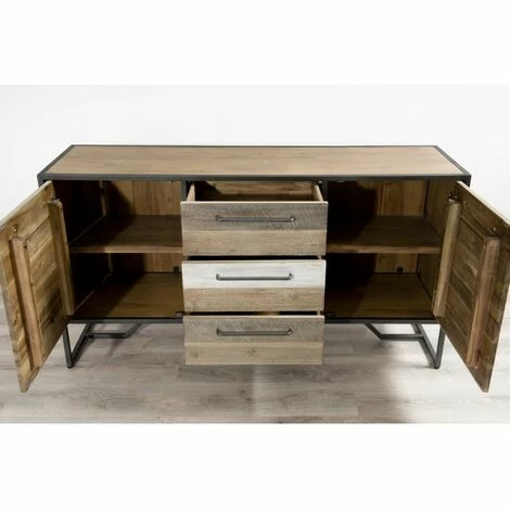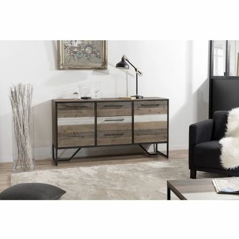 MACABANE LEANDRE – Buffet 2 Portes 3 Tiroirs Acacia Et Acier – Multicouleurs Vieillies
