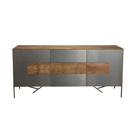 Buffet 2 portes 3 tiroirs bois Teck recyclé façade et pieds métal gris anthracite. Dimensions : 167 x 45 x 78 cm. Article en Teck recyclé et Acier. Cet article est composé de bois recyclé ! Le bois recyclé est un bois récupéré de vieilles charpentes, de coques de bateaux ou tout bois de récupération ayant déjà eu une longue vie. C’est ce qui lui donne cet aspect vieilli et authentique avec ses imperfections qui font tout son charme. Acquérir du bois recyclé est une initiative écoresponsable qui permet de lutter contre la déforestation. Vous aimez les tendances décos industrielles ? Ce large buffet en teck recyclé et acier est la pièce qu’il vous faut ! De larges dimensions pour un rangement optimal, des portes sans poignées et des pieds fins pour un look vraiment minimaliste N’hésitez plus pour vous procurer ce meuble chic et élégant. Meuble monté, pieds à visser