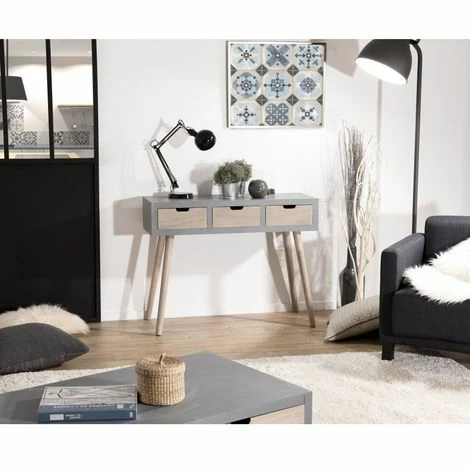 Console grise 3 tiroirs beiges bois Pin. Dimensions : 100 x 34 x 77 cm. Article en MDF et PIN. Design très jeune habitat et tendance à la fois avec ce subtil effet béton. Meuble monté, pieds à visser