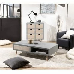 Table basse grise 1 niche 2 tiroirs beiges bois Pin. Dimensions : 120 x 60 x 38,5 cm. Article en MDF et PIN. Design très jeune habitat et tendance à la fois avec ce subtil effet béton. Meuble monté, pieds à visser