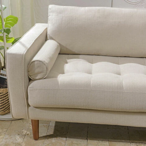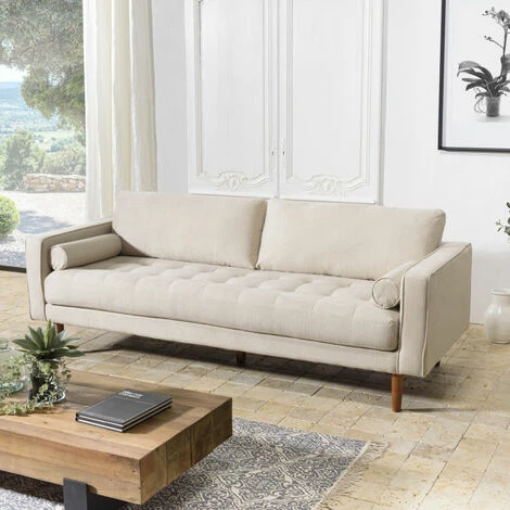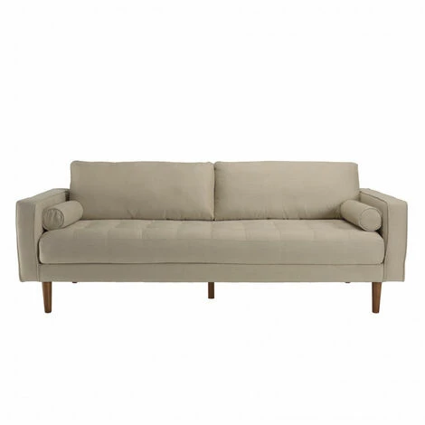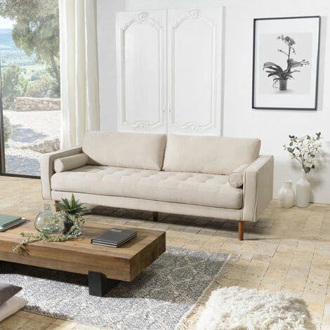 Canapé beige 2 coussins et pieds en bois. Dimensions : 225 x 93 x 90 cm. Article en Tissu Polyester / Hévéa / Mélèze / Contreplaqué. Reposez-vous grâce à ce large canapé beige 4 places. Très accueillant avec son assise capitonnée et ses gros coussins, vous pourrez partager des moments à plusieurs. Il est tout à fait possible d’y ajouter un plaid pour être au summum du confort. Meuble démonté