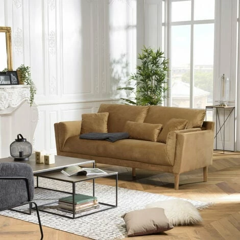 Canapé PARIS 3 places tissu couleur camel pieds bois. Dimensions : 199 x 85 x 91 cm. Article en velours et métal. Ce grand canapé peut accueillir jusqu’à 3 personnes, pour que vous puissiez passer d’agréables moments en famille ou entre amis. Sa couleur douce s’associera parfaitement à votre décoration. Son beau velours côtelé vous fera littéralement craquer. Meuble monté, pieds à visser