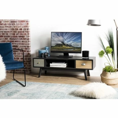 Meuble TV noir 2 tiroirs marrons motifs Pin. Dimensions : 120 x 40 x 40 cm. Article en MDF et Pin. Mélange du style scandinave et industriel, cette gamme ravira à merveille l’univers du jeune habitat… Meuble monté, pieds à visser