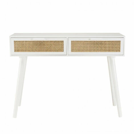 Console blanche 2 tiroirs cannage naturel. Dimensions : 110 x 33 x 81 cm. Article en MDF plaqué frêne/Rotin. Apportez de la clarté dans votre intérieur grâce à cette jolie console blanche. Composée de bois et de rotin, elle est totalement naturelle. Ses deux tiroirs sont vraiment pratiques pour y ranger vos affaires essentielles à portée de main, dans une entrée ou tout autre pièce de votre choix. Meuble monté, pieds à visser
