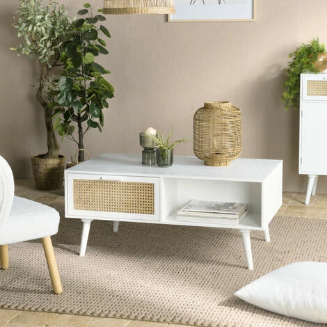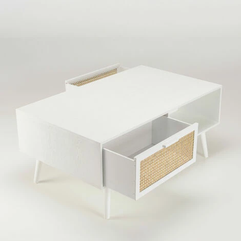 MACABANE SANDRO – Table Basse Blanche 2 Tiroirs 1 Niche Cannage Naturel – Blanc