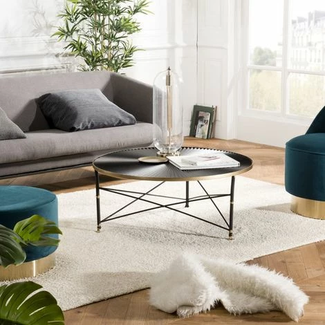 Table basse ronde 91x91cm ceinture dorée pieds métal noir. Dimensions : 91 x 91 x 39 cm. Article en Métal et Panneaux de fibres à densité moyenne. Osez l’originalité ! Laissez-vous tenter par cette collection, des meubles design en métal avec des formes géométriques tendances pour décorer votre maison avec finesse. Imaginez cette table basse ronde au centre de votre pièce de vie ! Très sophistiquée, elle ajoutera une touche d’élégance dans votre intérieur. Sa couleur noire et ses détails dorés feront toute la différence. Meuble monté