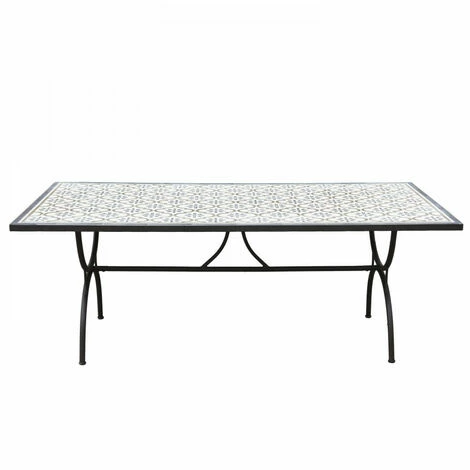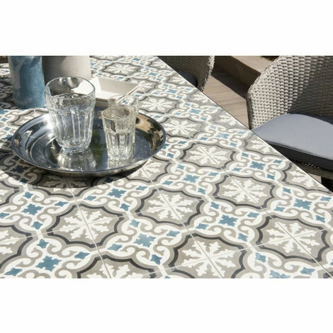 SALON DE JARDIN CARREAUX CIMENT. Dimensions : 63 x 62 x 78 cm ; 203 x 102 x 74 cm. Table en carreaux de ciment et métal. Chaises en rotin synthétique et bois d’acacia huilé. LOT COMPRENANT : 1 table rectangulaire pliante 840002 – 6 fauteuils rotin synthétique couleur naturelle avec coussin écru, pieds acacia 840004 Profitez de votre extérieur avec ce magnifique salon de jardin. Cette grande table sera parfaite pour vos repas en extérieur. La couleur de cette table se marie très bien avec le rotin synthétique couleur écru des fauteuils. Confortables et tendances, ces 6 fauteuils vous permettront de pleinement apprécier vos moments à table en extérieur. Il est fortement conseillé d’abriter ce mobilier et de le protéger du gel pendant la période hivernale afin qu’il ne s’abîme pas. Meuble monté, pieds à visser
