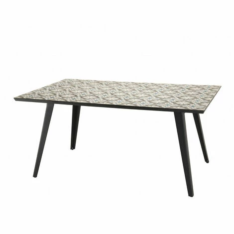 Salon de jardin carreaux ciment 4/6 personnes. Dimensions : Chaises : 63 x 62 x 78 cm ; Table : 62 x 102 x 74.5 cm. Table en carreaux de ciment et métal; Chaises en rotin synthétique et métal. LOT COMPRENANT : 1 table carreaux de ciment, pieds noir métal – 6 fauteuils rotin synthétique avec coussin gris, pieds noirs métal. Pour un bel été, ce salon de jardin est idéal. Cette grande table sera parfaite pour vos repas en extérieur. Les motifs des carreaux sont originaux pour donner du peps à votre extérieur. Sa couleur se marie bien avec le gris clair des fauteuils. Confortables et tendances, ces fauteuils vous permettront d’apprécier vos moments à table. Il est fortement conseillé d’abriter ce mobilier et de le protéger du gel pendant la période hivernale afin qu’il ne s’abîme pas. Meuble monté, pieds à visser