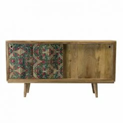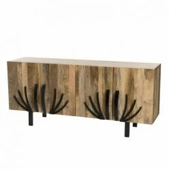 MACABANE IRENE – Buffet Bois Manguier 177x45cm 4 Portes 2 étagères Motifs Noirs Goa – Naturel