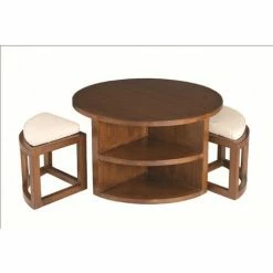 MACABANE EDEN – Table Basse Ronde Marron 2 Tabourets Avec Coussins écrus Bois Mindi – Chocolat